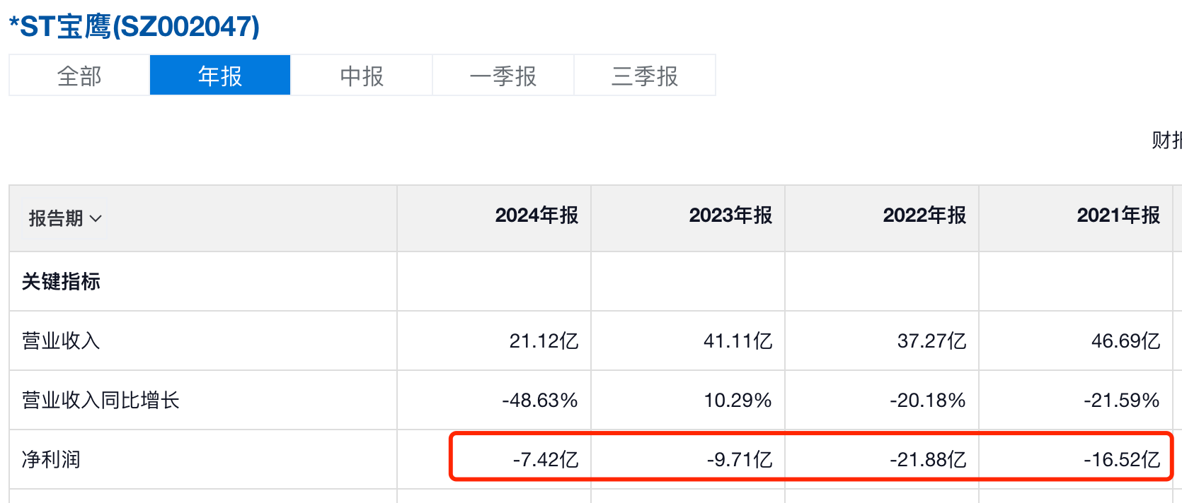 财报数据显示,2021-2024年,宝鹰股份分别亏损16.52亿元、21.88亿元、9.71亿元、7.42亿元。